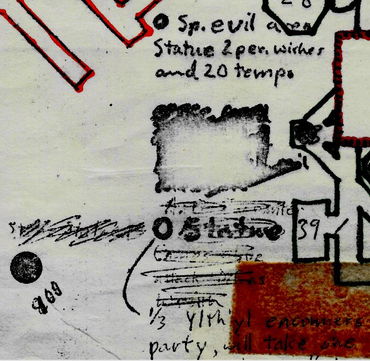 Level 10 has two especially interesting examples of these "nonD&D" map notes, and in this case they seem to have been re-written on the copies. One reads "Sp. evil area Statue 2 perm wishes and 20 temps".